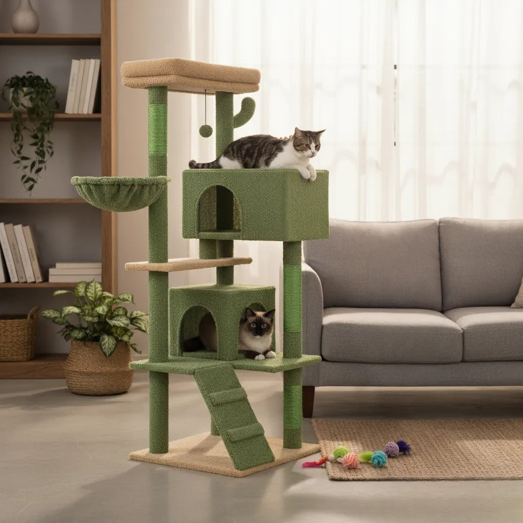 Cet arbre propose plusieurs zones de repos : deux condos avec portes, un hamac et un perchoir supérieur, permettant aux chats de se reposer, de courir à l’intérieur, de dormir ou de s’étirer selon leurs besoins. Les pompons suspendus remplaçables ajoutent un espace de jeu interactif et inclus un pompon supplémentaire pour varier les plaisirs.