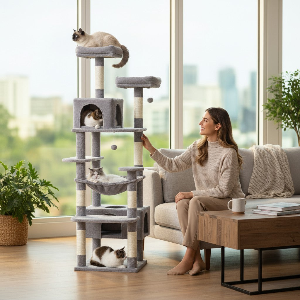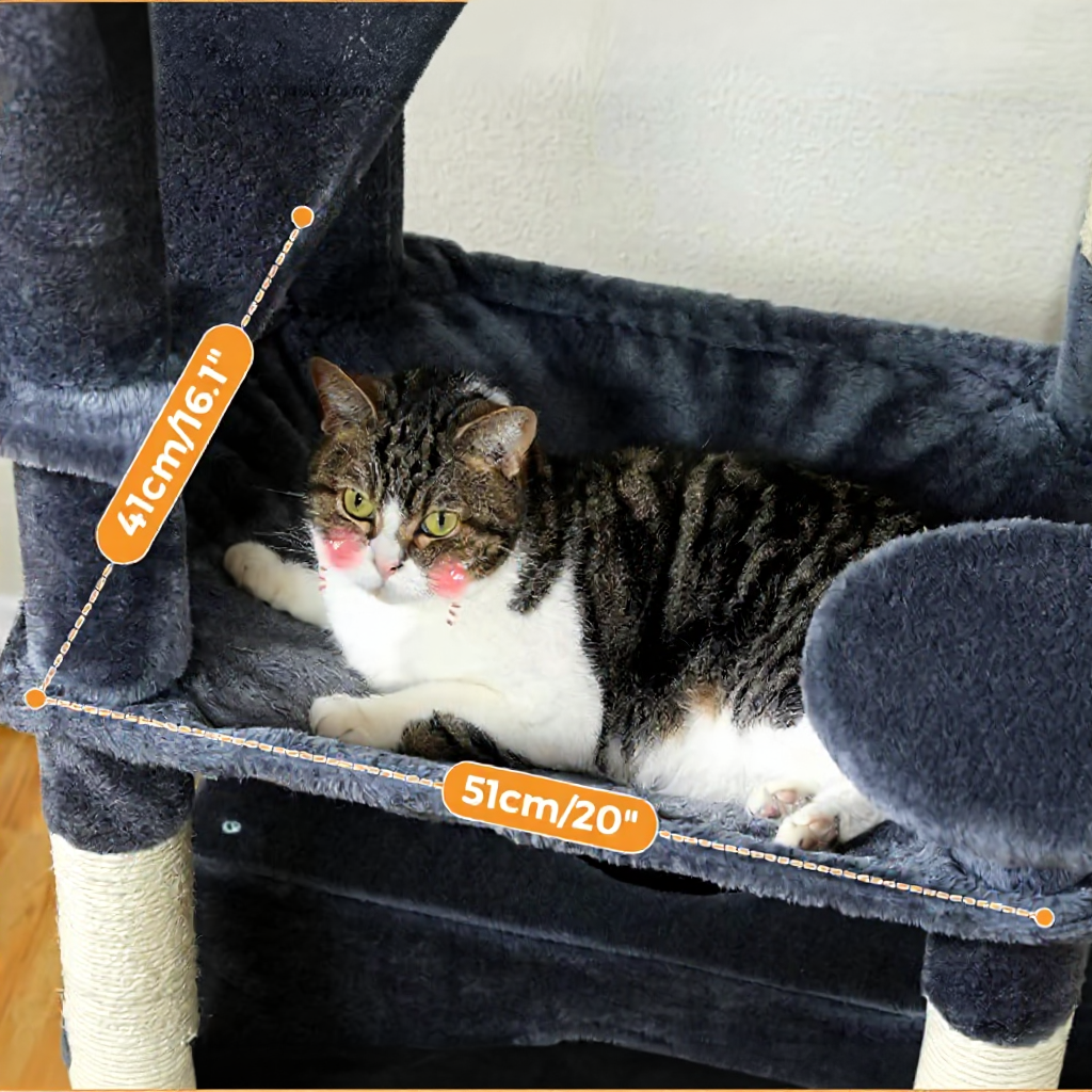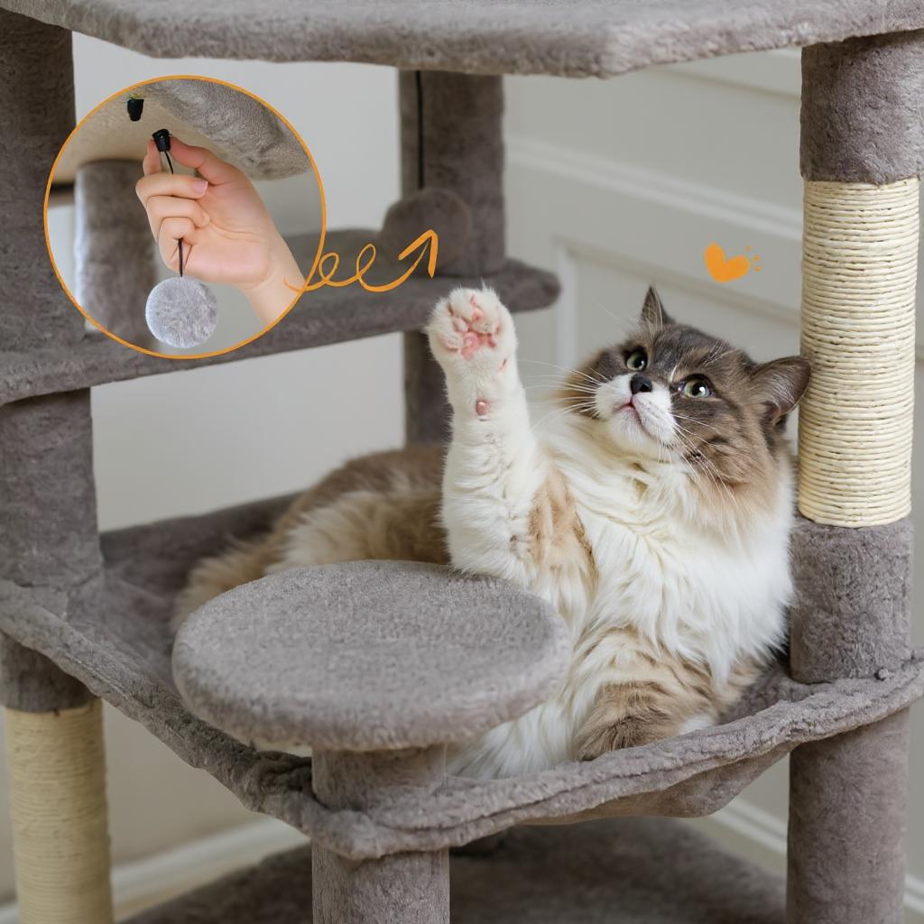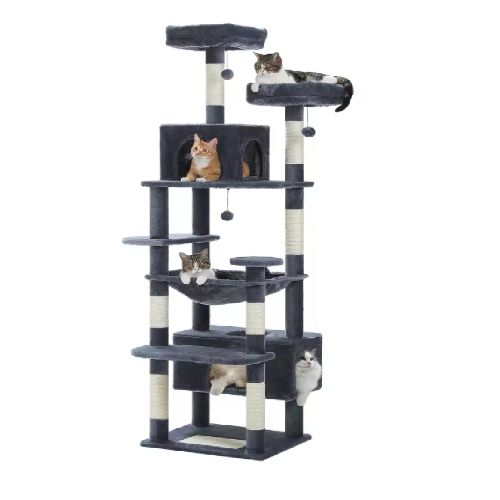 Avec une hauteur totale de 183 cm, cette tour d’intérieur combine poteaux en sisal naturel, condos rembourrés et hamac spacieux pour offrir un environnement complet et stimulant. Chaque zone a été pensée pour favoriser l’escalade, la détente et le jeu collectif.