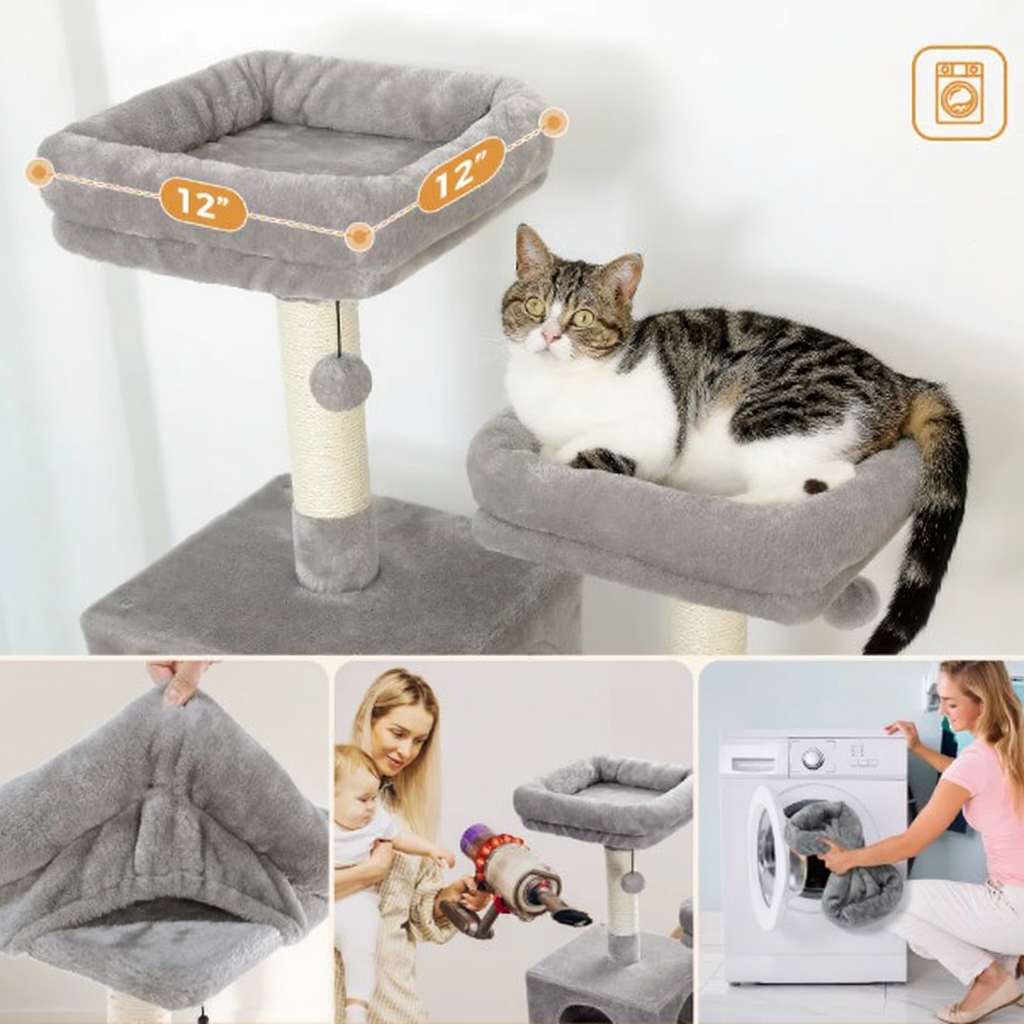 Il suffit de passer régulièrement un aspirateur ou une brosse pour enlever les poils et poussières. Les housses amovibles de certains modèles sont lavables en machine. Les poteaux en sisal peuvent être remplacés au besoin, ce qui prolonge la durée de vie du produit.