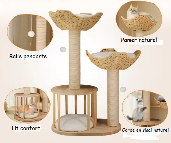 Offrez à votre chat un espace de jeu, de repos et de détente avec le Centre d’Activités Griffes d’Or, conçu pour répondre aux besoins comportementaux naturels des félins. Cet arbre à chat multifonction permet à votre compagnon de sauter, grimper, se cacher et se reposer en toute sécurité.
