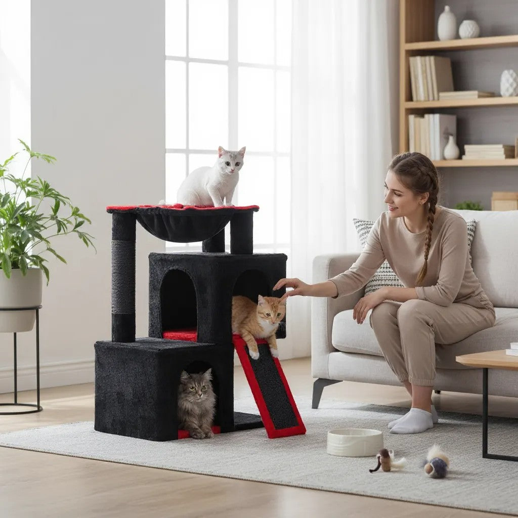 Conçu pour le bien-être félin, il comprend un hamac profond, un condo douillet et un perchoir supérieur offrant une belle vue d’ensemble. Les poteaux en sisal naturel permettent à votre chat de griffer sans abîmer vos meubles, tandis que le pompon suspendu remplaçable stimule le jeu et la curiosité.