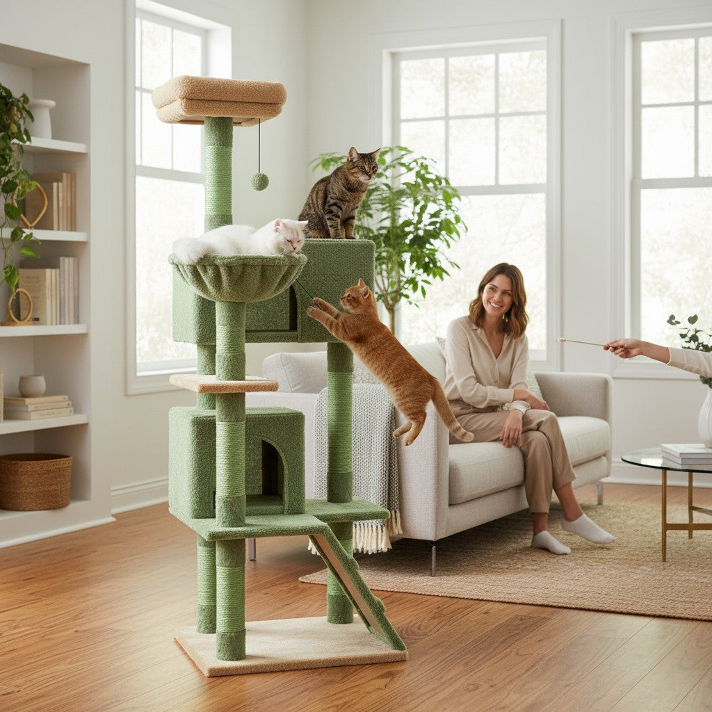 Cet arbre propose plusieurs zones de repos : deux condos avec portes, un hamac et un perchoir supérieur, permettant aux chats de se reposer, de courir à l’intérieur, de dormir ou de s’étirer selon leurs besoins. Les pompons suspendus remplaçables ajoutent un espace de jeu interactif et inclus un pompon supplémentaire pour varier les plaisirs.